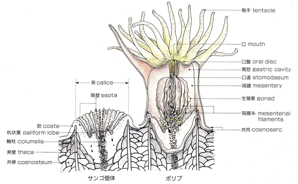 山野:サンゴは樹木のように枝分かれしているものもあり、一見、植物のように見えるのですが、実は動物です。イソギンチャクやクラゲの仲間で、刺胞動物(腔腸動物)に分類されています。サンゴには、サンゴ礁を作る造礁サンゴ(イシサンゴ)と宝飾品として利用される宝石サンゴがあり、ともに刺胞動物です。造礁サンゴは浅い海にすんで成長が早いのに対して、宝石サンゴは深い海でゆっくりと成長します。