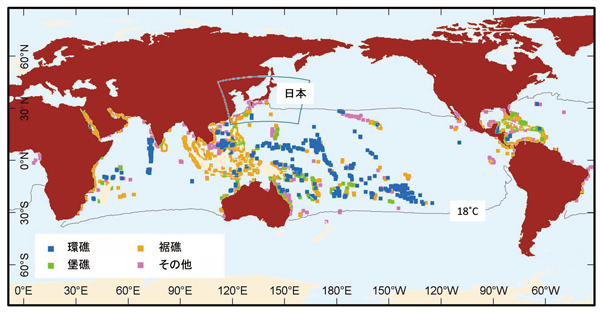 山野:サンゴは水温が30℃くらいまでの暖かい海が最も生息に適しています。そのため、熱帯や亜熱帯の海岸に多く分布しています。世界で一番サンゴの種類が多いのは、インドネシア、フィリピン、ニューギニアに囲まれた海域で、450種以上のサンゴが分布しています。この海域から離れるにしたがって、サンゴの種類は減少することが知られています。また、インド洋と太平洋には基本的に同じ種類のサンゴが分布していますが、大西洋には違う種類のサンゴが分布しており、種類も少なくなっています(図3)。