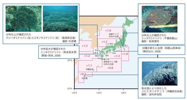 サンゴが減少した原因なども探っています。これまで、沖縄では高水温による白化現象によってサンゴが大幅に減少してしまったことや、九州から北では水温が上昇してサンゴの分布が北上していることを明らかにしてきました(図4、図6)。また、土砂の流出など陸からの負荷がサンゴに及ぼす影響についても実証しました。