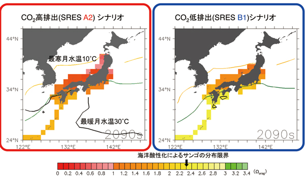 私たちは、将来の地球環境を予測する気候モデルの出力結果を使い、地球温暖化と海洋酸性化によるサンゴの分布の変化予測をしています。それによれば、温暖化シナリオの1つである多元化社会シナリオの下では、海水温上昇よりも海洋酸性化の影響の方がはるかに大きく、日本近海でサンゴが生息できる領域が将来大幅に少なくなるという結果が得られました(図7)。