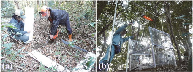 2008年12月の中旬に、国立環境研究所が独自に開発した自動開閉チャンバーシステムを、宮崎大学田野フィールド内のコジイ林に設置しました(写真1a)。チャンバーは、塩化ビニル製の透明な箱です(縦90×横90×高さ50cm)。制御装置内のプログラムによって、1つのチャンバーは4分間だけ蓋が閉まり、その間にチャンバー内の二酸化炭素が測定されます。4分が経過した後は解放されて、次のチャンバーが閉まる様に設計されています。本観測サイトには15個のチャンバーを設置していますので、1時間毎に全てのチャンバーで1回ずつ測定が行われ、そのサイクルを繰り返すことで、常時二酸化炭素の放出速度を測定する事ができます(図1)。15個のチャンバーのうち、10個のチャンバー周辺はチェンソーで樹木の根を深さ40cmまで切り、その後30cmまで塩化ビニルの板を挿入しています。そうする事で、周辺からチャンバー内の土壌に樹木の根が侵入する事を防ぎ(写真1a)、根呼吸を極力減らして、微生物呼吸のみを観測できます。また、その様な処理を行った測定区のうち半数には、地表面から約1.6mの高さに赤外線ヒーターを取り付け、温暖化区としました(写真1b)。温暖化区では、ヒーターを取り付けていない対照区と比べて、地下5cmの温度が約2.5℃上昇する様に設定されています。温暖化区と対照区における二酸化炭素の放出速度を6年間にわたって比較する事で、微生物呼吸に対する温暖化の長期的な影響を評価しました。